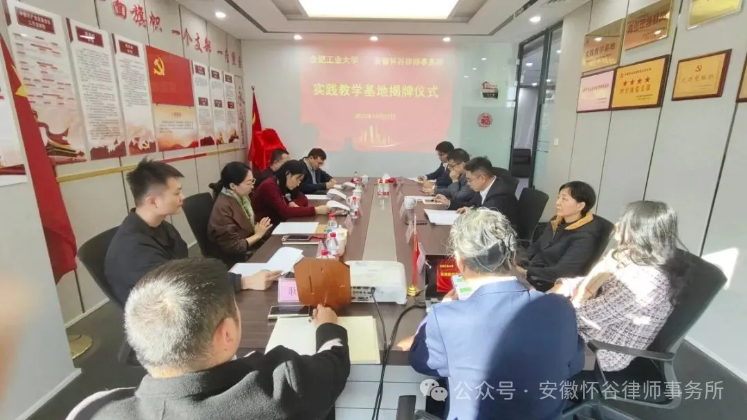 2025年10月23日,合肥工业大学在本所举行实践教学基地签约揭牌仪式。合工大文法学院副院长霍敬裕教授、院党委副书记兼纪委书记钟敏、副教授王梦飞、支部委员余昊哲、冯科臻,怀谷所党支部书记、主任孙永标,律所支委成员、合伙人及部分律师代表参加。